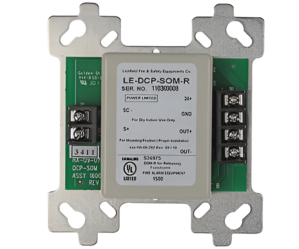 El módulo de salida supervisada (LE-DCP-SOM-R) está diseñado para sistemas de rociadores de acción previa con bloqueo único. Durante una condición de alarma, se activará la salida LE-DCP-SOM-R, lo que activará una válvula solenoide, lo que permitirá que el agua llene las tuberías del sistema de rociadores.